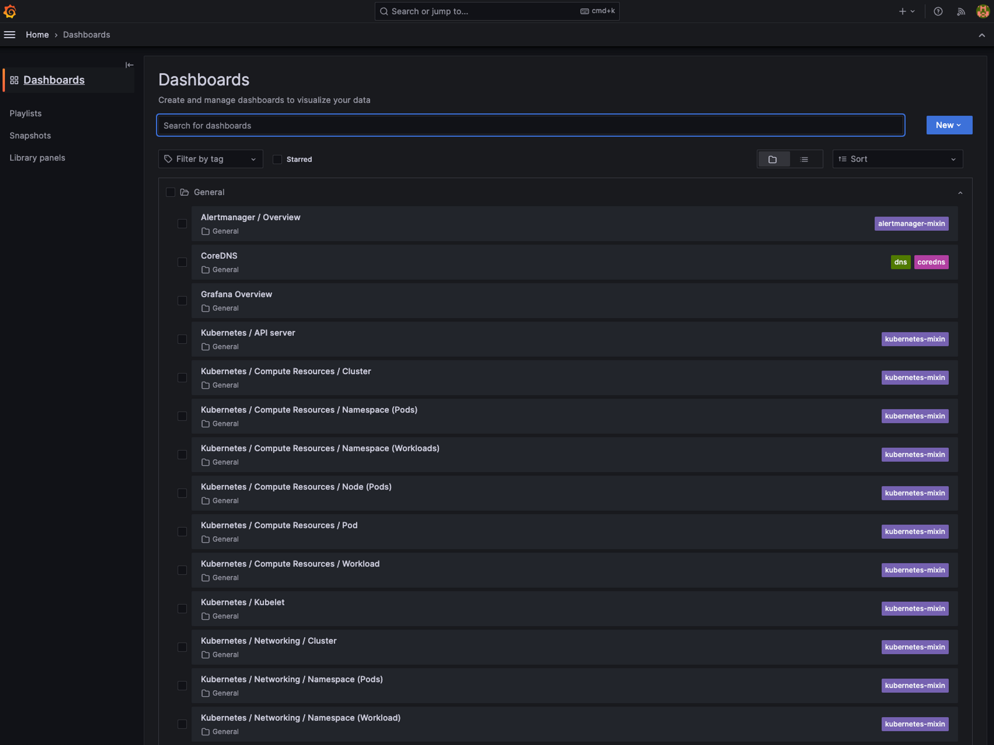 스택을 통해 설치하면 다음과 같이 기본적으로 설치되어 있는 대시보드들을 확인할 수 있다.
