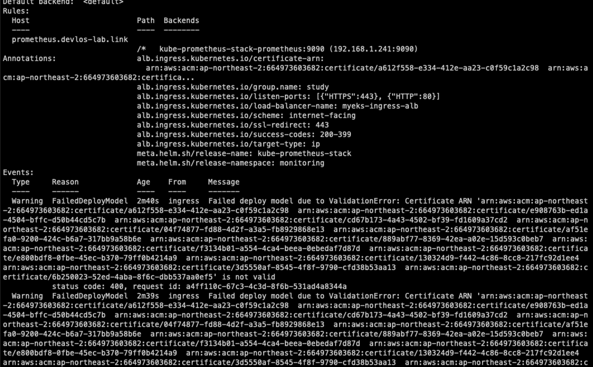 원인을 몰라 클러스터를 4~5번 재생성했지만 동일한 문제가 발생했다. Ingress를 describe 명령어를 이용해서 확인해 보니 ARN 인증 관련 오류들이 떠있었다.