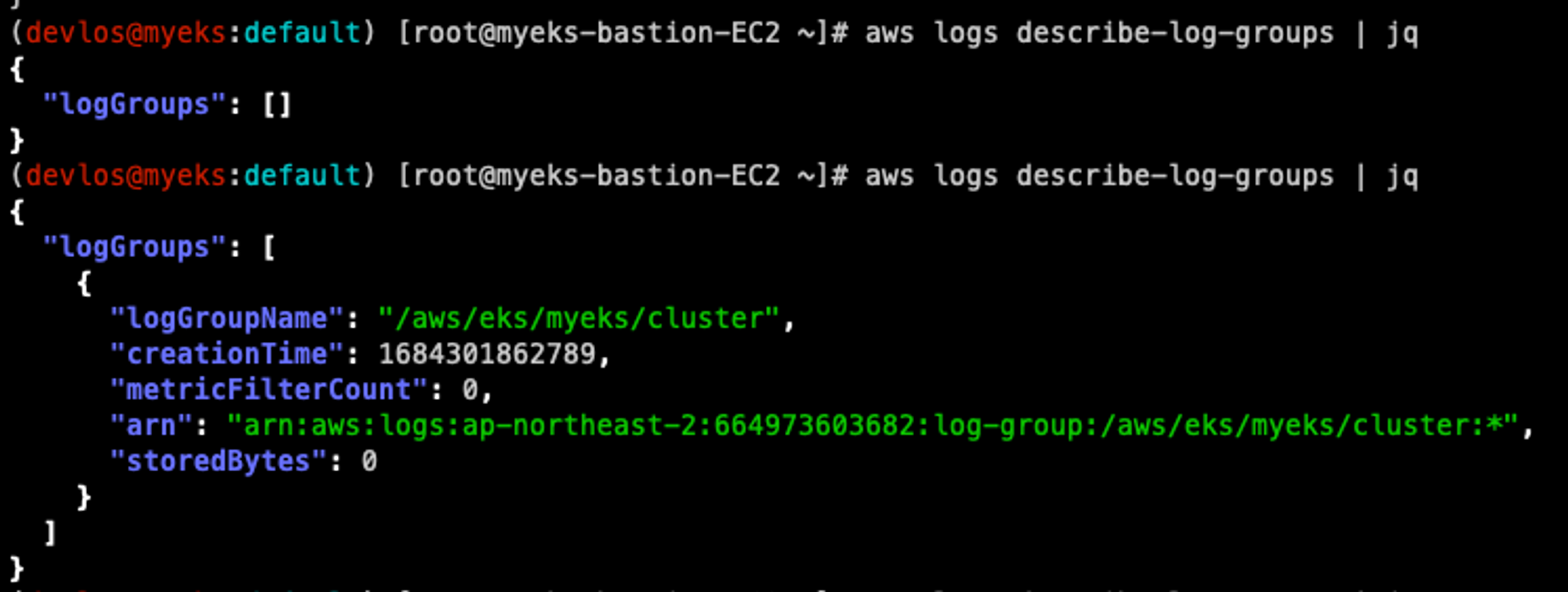 로그는 위에서 생성한 로그 그룹 경로에 차곡차곡 쌓이게 된다. 다음의 명령어로 로그 그룹에 쌓인 로그 정보들을 확인할 수 있다.