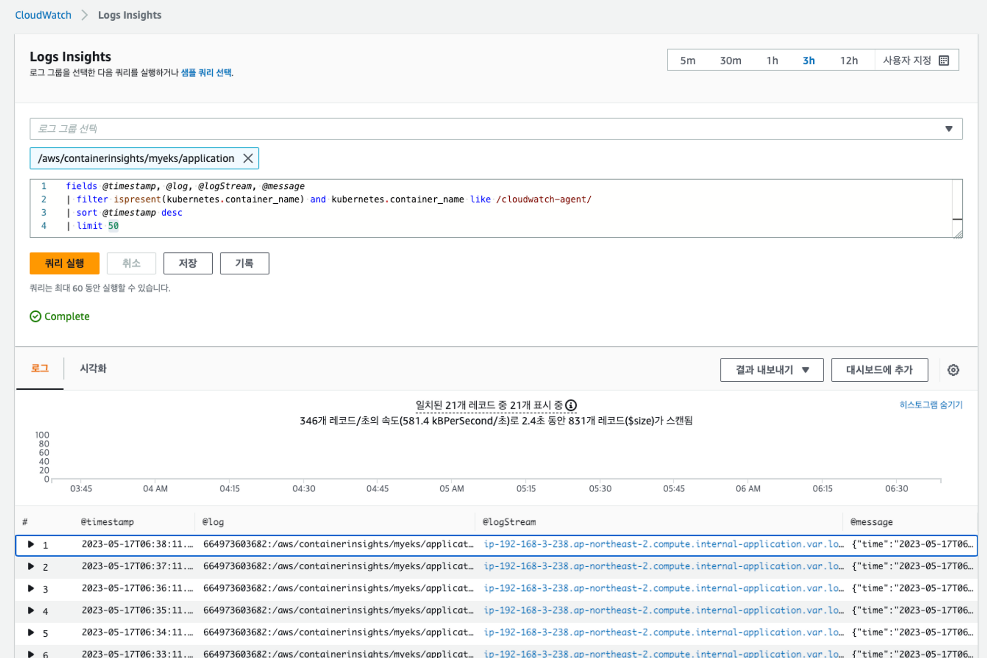 실제로 CloudWatch가 로그와 매트릭을 수집하는지 실습을 통해서 확인해 보았다. 먼저 노드의 로그를 확인해보았다.