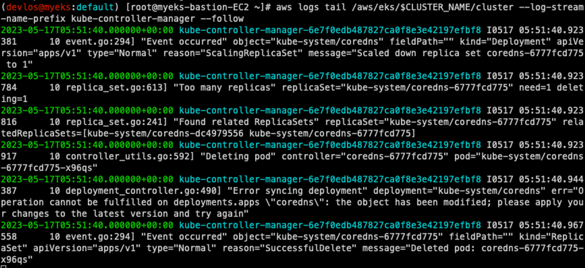 aws logs tail /aws/eks/$CLUSTER_NAME/cluster --filter-pattern "error” 과 같이 특정 필터패턴에 대한 정보도 확인할 수 있다.