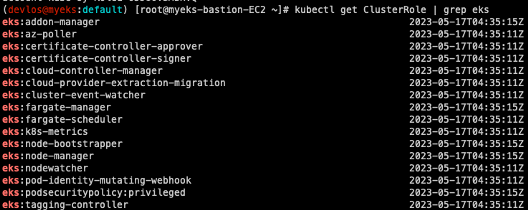 AWS Management Console과 연동되어 정보들을 확인할 수 있도록 클러스터에는 아래와 같은 eks 관련 ClusterRole들이 생성되어 있다.