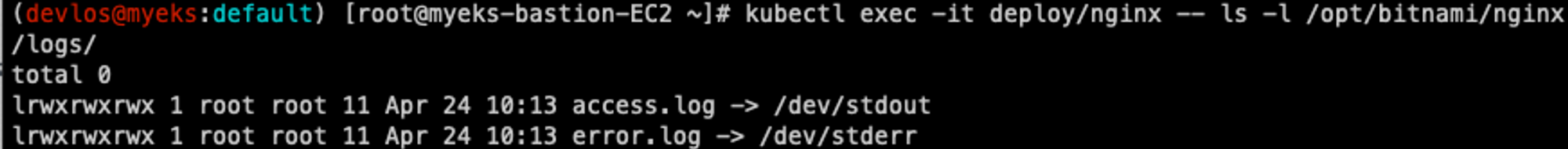 Bitnami Nginx 이미지를 확인해보면 심볼릭 링크를 통해 /dev 디렉터리에 access log와 error log를 기록하는 것을 확인할 수 있다. 이 경로를 통해 kubectl logs 명령을 실행했을 때 애플리케이션의 로그를 확인할 수 있다.