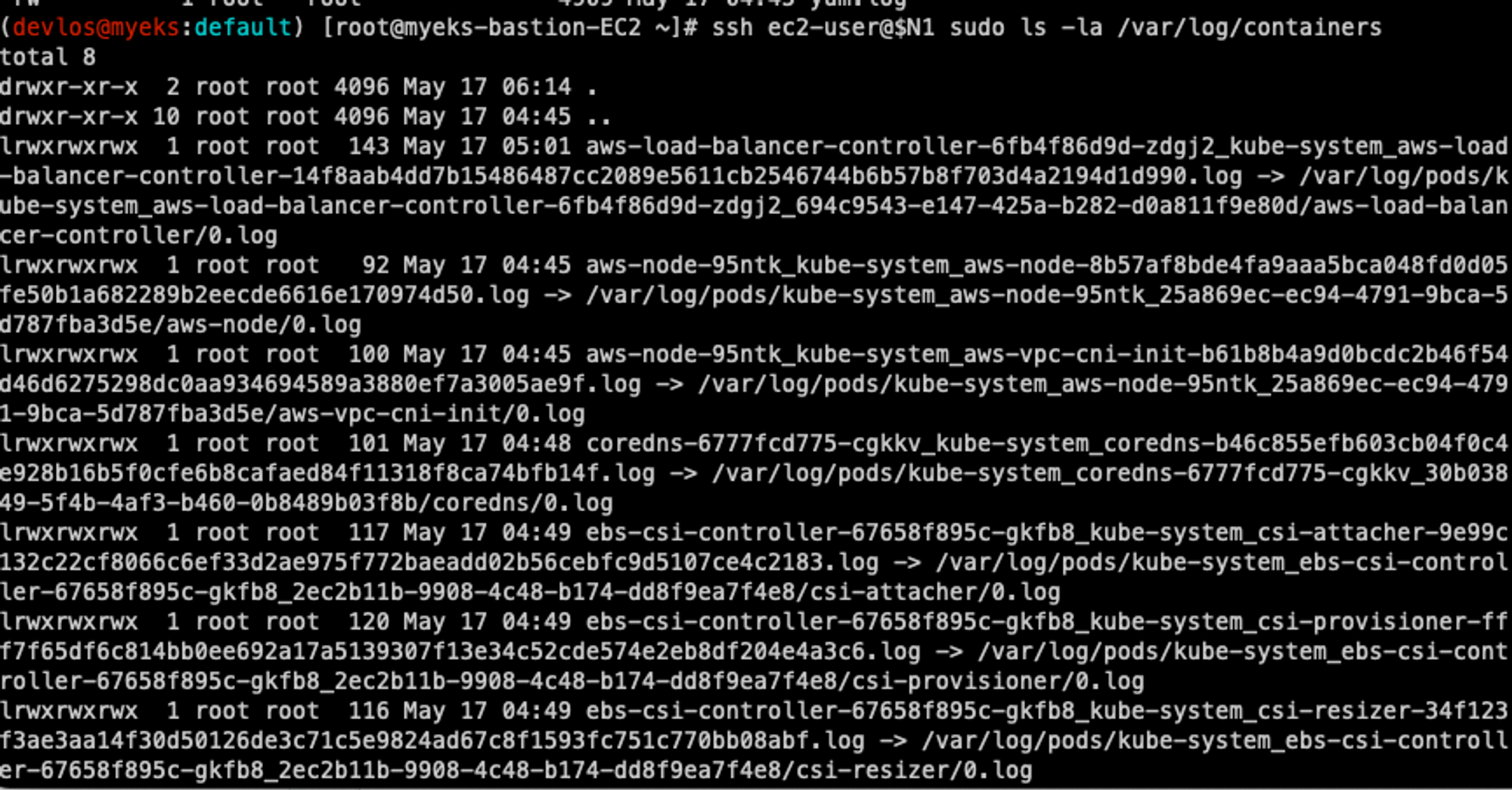 ssh ec2-user@$N1 sudo ls -al /var/log/containers