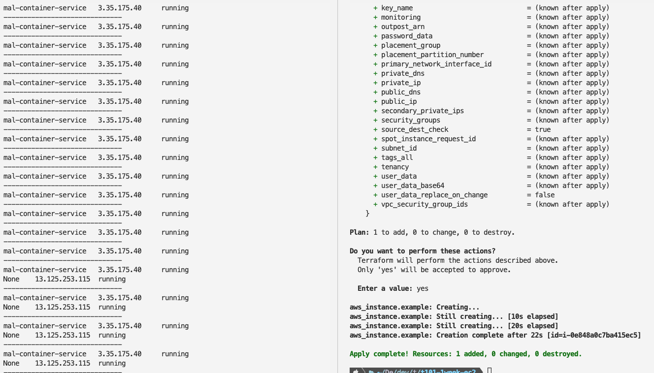 - 정의한 코드가 어떤 인프라를 만들게 되는지 미리 예측 결과를 보여줍니다. 단, plan을 한 내용에 에러가 없더라도 실제 적용 시엔 에러가 발생할 수 있습니다.