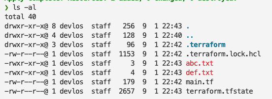 - Terraform에서 사용하는 리소스 프로바이더를 설치합니다. 지정한 backend에 상태 저장을 위한. tfstate 파일을 생성합니다. 기본적으로 로컬에 backend가 생성되고, 가장 마지막에 적용한 테라폼 내역이 저장됩니다.