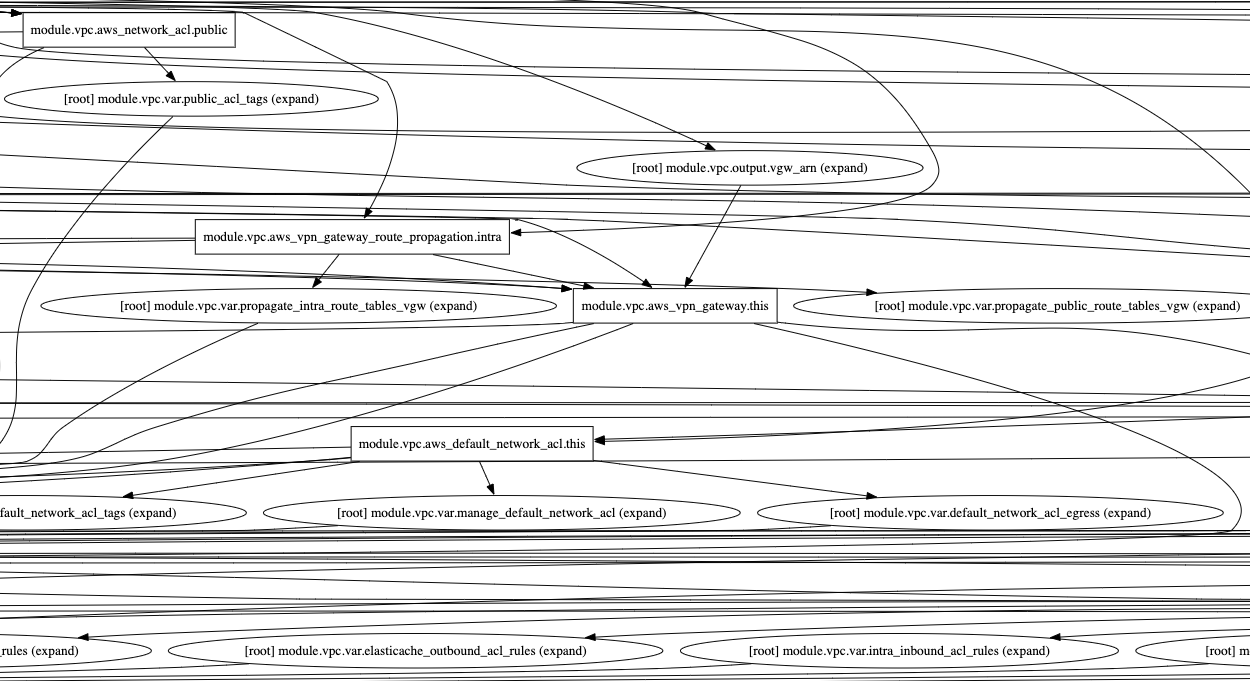 예를 들어 이전 스터디에 참여하셨던 HallsHolicker님께서 만들어주신 EKS 기반 클러스터 생성 테라폼파일을 clone 하여 그래프를 생성해 보면, 이런 식으로 종속성들을 파악할 수 있게끔 나오게 됩니다.