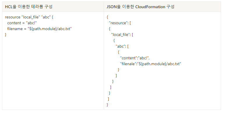 아래의 그림은 스터디에서 소개한 HCL과 JSON 포맷의 CloudFormation 구성인데, 이렇게 보니 좀 더 프로그래머 친화적인 언어의 느낌이 듭니다.