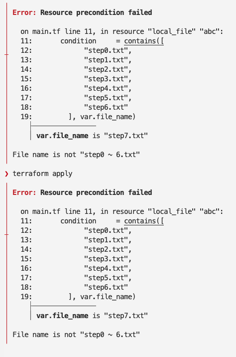 반대로 step7.txt라는 값을 default에 설정하면 lifecycle에 선언해 둔 조건에 만족하지 못하여 다음과 같이 에러가 발생하게 됩니다.