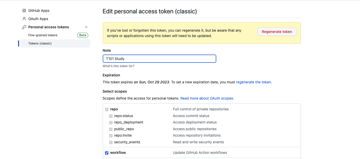 github > Settings > Developer Settings에서 Personal Access Token을 생성합니다.