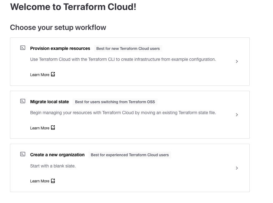 TFC 계정을 생성하고 나면 다음과 같이 workflow 세팅이 나옵니다. 여기에서 Create a new organization을 만듭니다. 조직명은 TFC에서 고유해야 합니다!