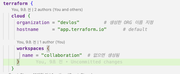 이번에는 TFC설정을 각각의 작업자에 지정해 줍니다. 클라우드 블록을 생성하게 되면 로컬이 아니라 원격지에서 스테이트를 관리하게 됩니다.