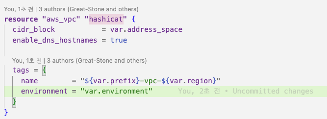 - aws_vpc의 tags.environment를 입력 변수 environment 값으로 선언