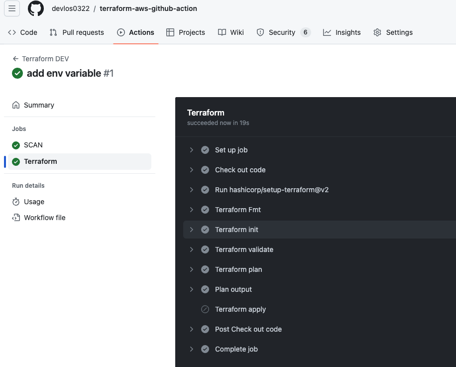 - env.TF_LOG: info : 로그 수준을 info로 출력해 실행 디버깅