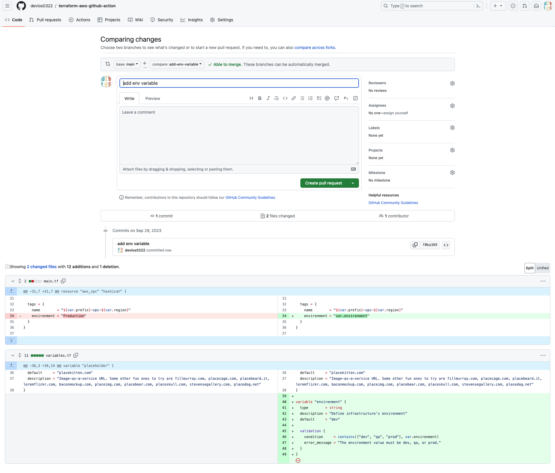 다음과 같이 브랜치를 생성하고 main.tf, variable.tf 소스코드를 수정합니다.