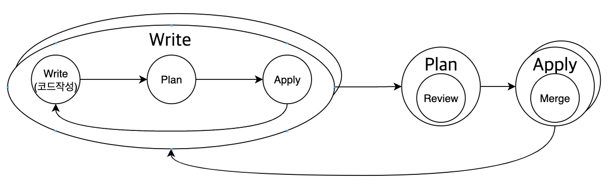 다만 위에서 설명드린 개인의 워크플로우를 하나의 Write단계로 봤을 때 여러 번의 Write 단계가 실행되고, 팀원 간 Plan을 통한 리뷰를 통해 코드를 검증합니다. 이러한 과정이 끝나면 Apply를 통해 실제 인프라 환경을 프로비저닝 하게 됩니다.