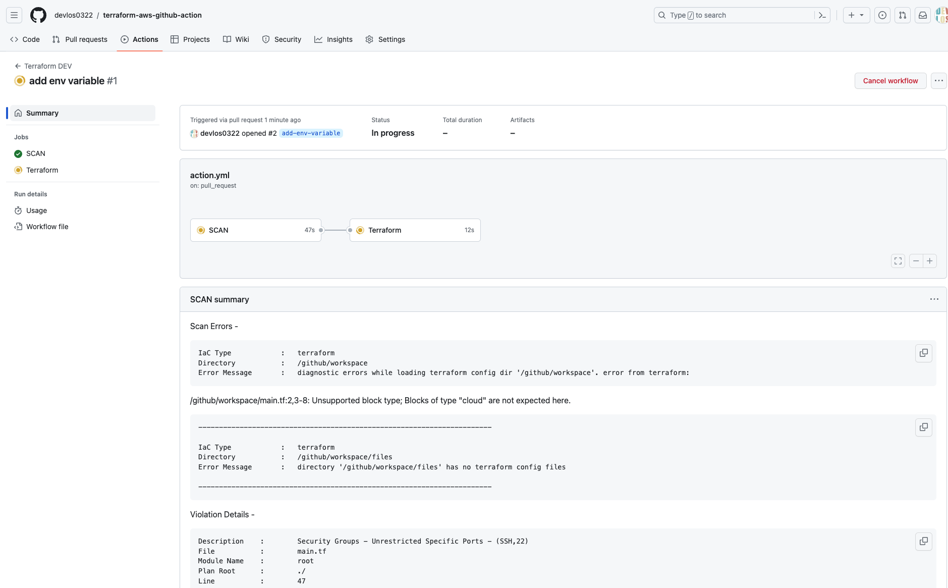 - Run terrascan : 테라폼 코드 검증 도구인 Terrascan을 실행
