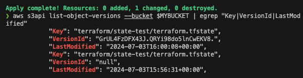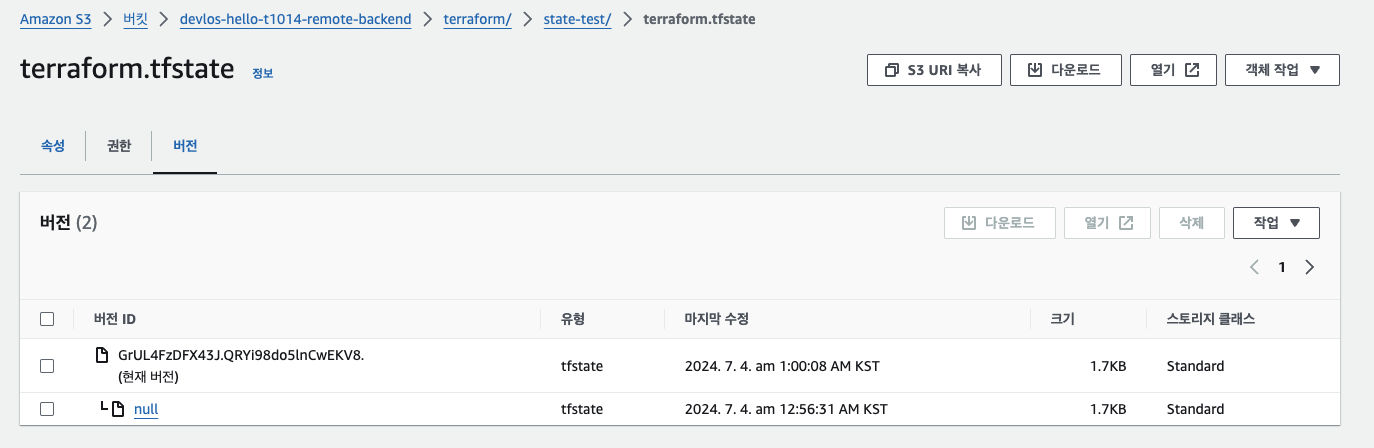 버킷의 버전 활성화를 사용하면 다음과 같이 terraform state 버전을 관리하여 backup 형태로 안전하게 사용할 수 있습니다.