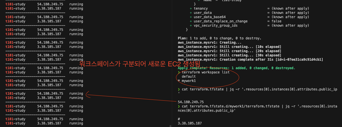 이를 통해 워크스페이스를 생성하여 리소스를 관리하면 state가 워크스페이스별로 격리되기 때문에 격리되어 리소스가 생성되는 것을 확인할 수 있었습니다.