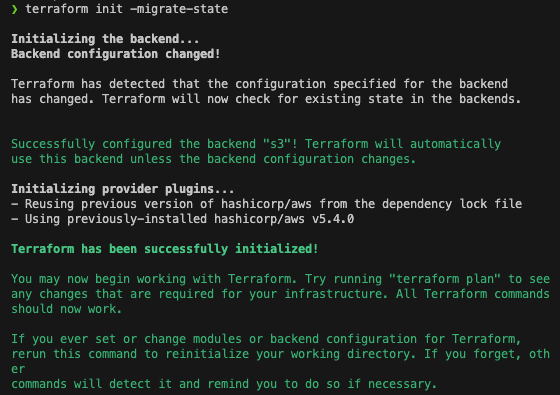 # backend설정이 달라졌으므로 terraform init 으로 적용