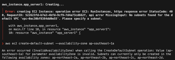 terraform apply를 수행하다 defalut subnet이 생성이 되어 있지 않아, 다음과 같은 오류가 발생했습니다.