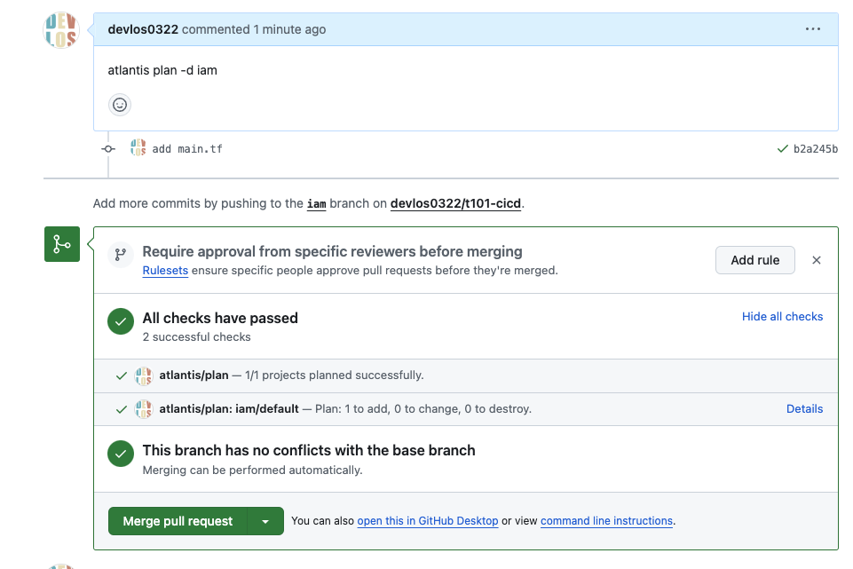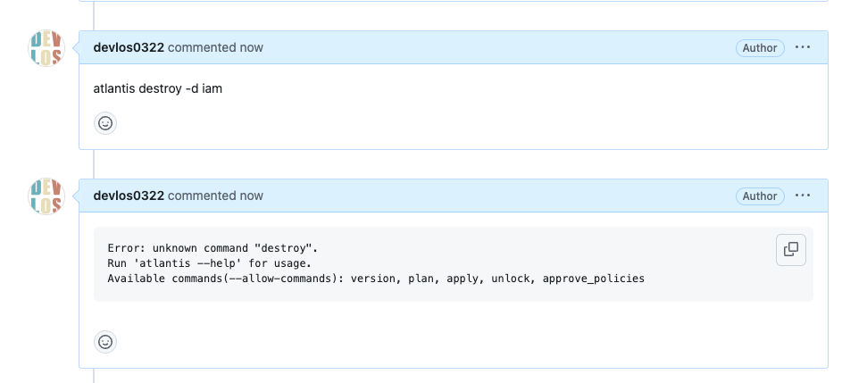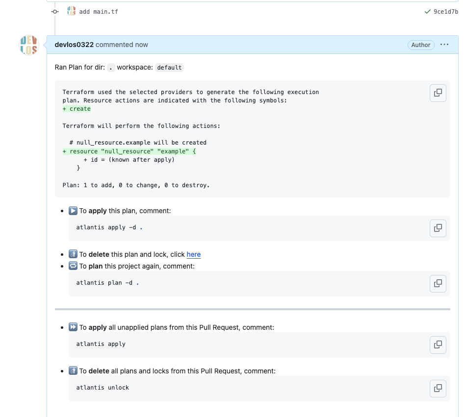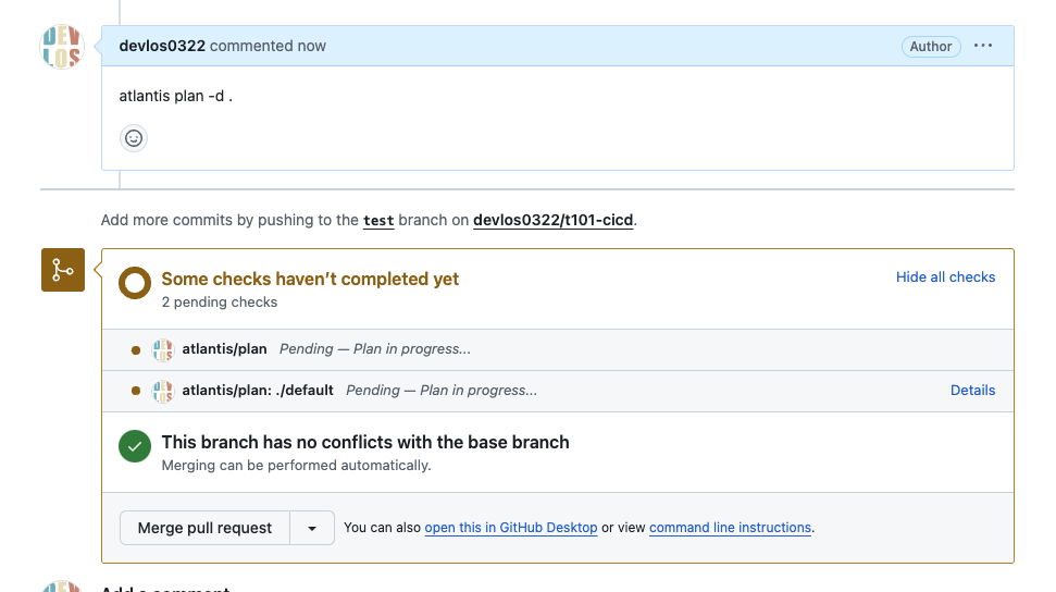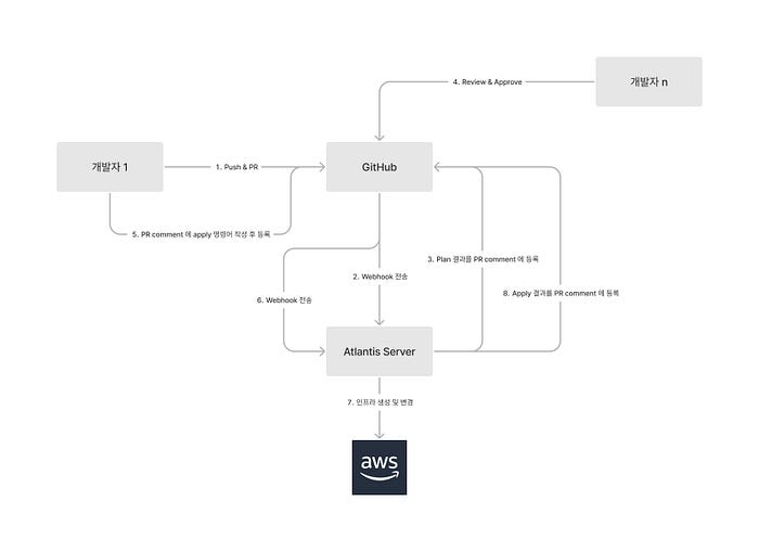 Atlantis는 Hootsuite에서 사용하던 Terraform에서 협업하기 위한 도구입니다. Atlantis의 핵심 기능을 통해 개발자와 운영자는 Terraform 풀 리퀘스트에서 직접 실행 terraform plan, apply 할 수 있습니다. 그런 다음 Atlantis는 명령의 출력으로 풀 리퀘스트에 다시 주석을 달 수 있습니다.