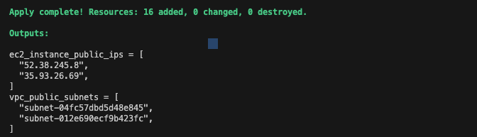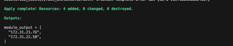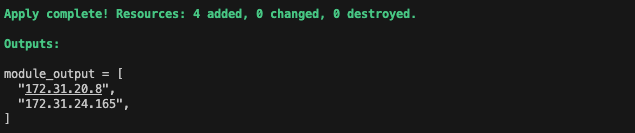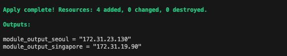 모듈을 활용하면 반복되는 리소스의 묶음을 최소화할 수 있습니다. 이전 실습에서 생성한 모듈을 호출하여 실행하면 다음과 같이 정상작동 하는 것을 확인할 수 있습니다.