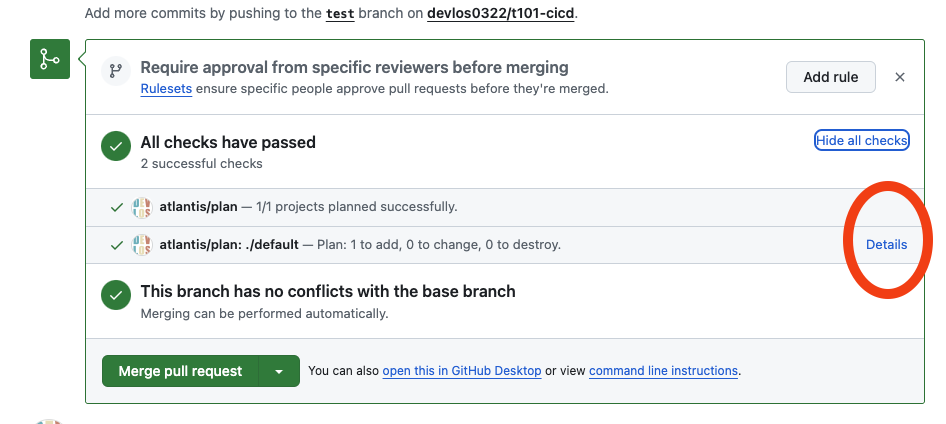 atlantis plan -d . 를 코멘트로 등록하면 다음과 같이 Details를 클릭했을 때 plan이 수행된 것을 확인할 수 있습니다.