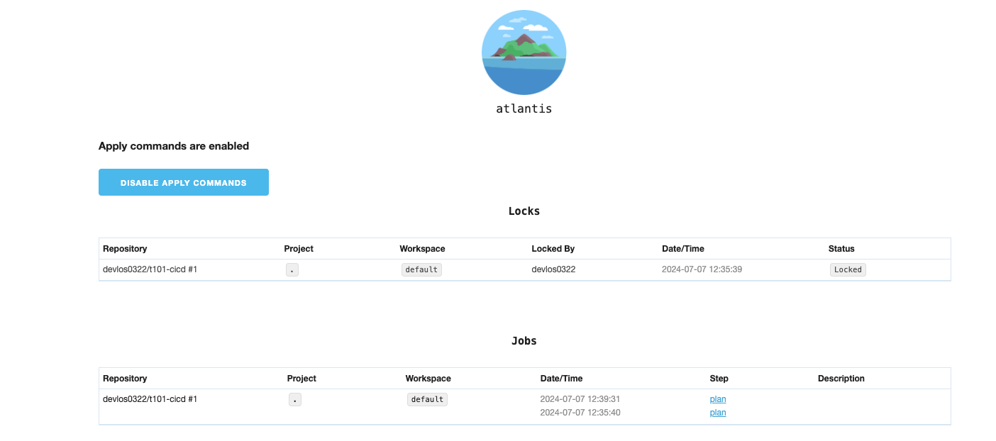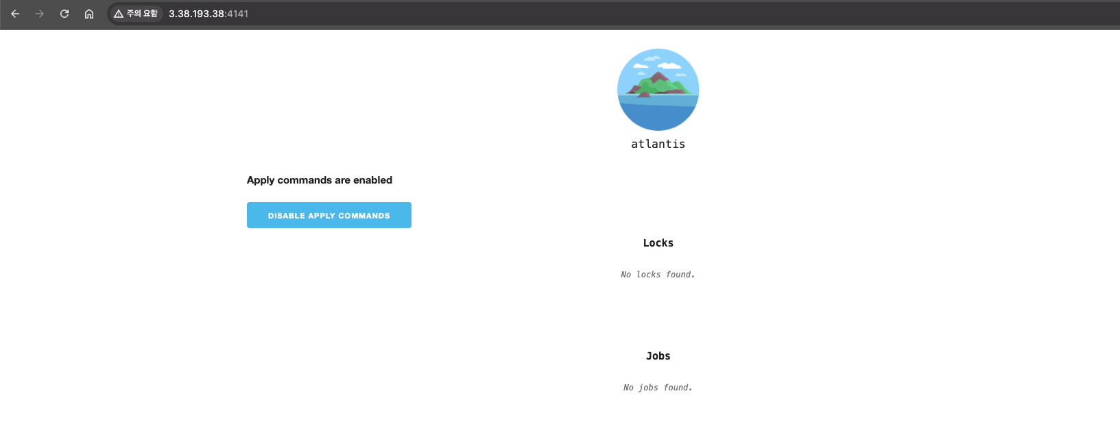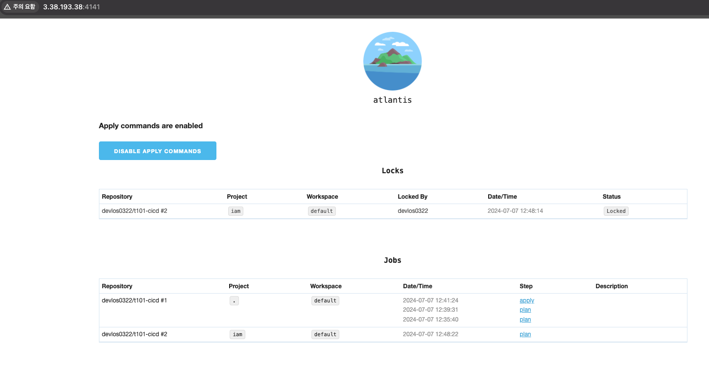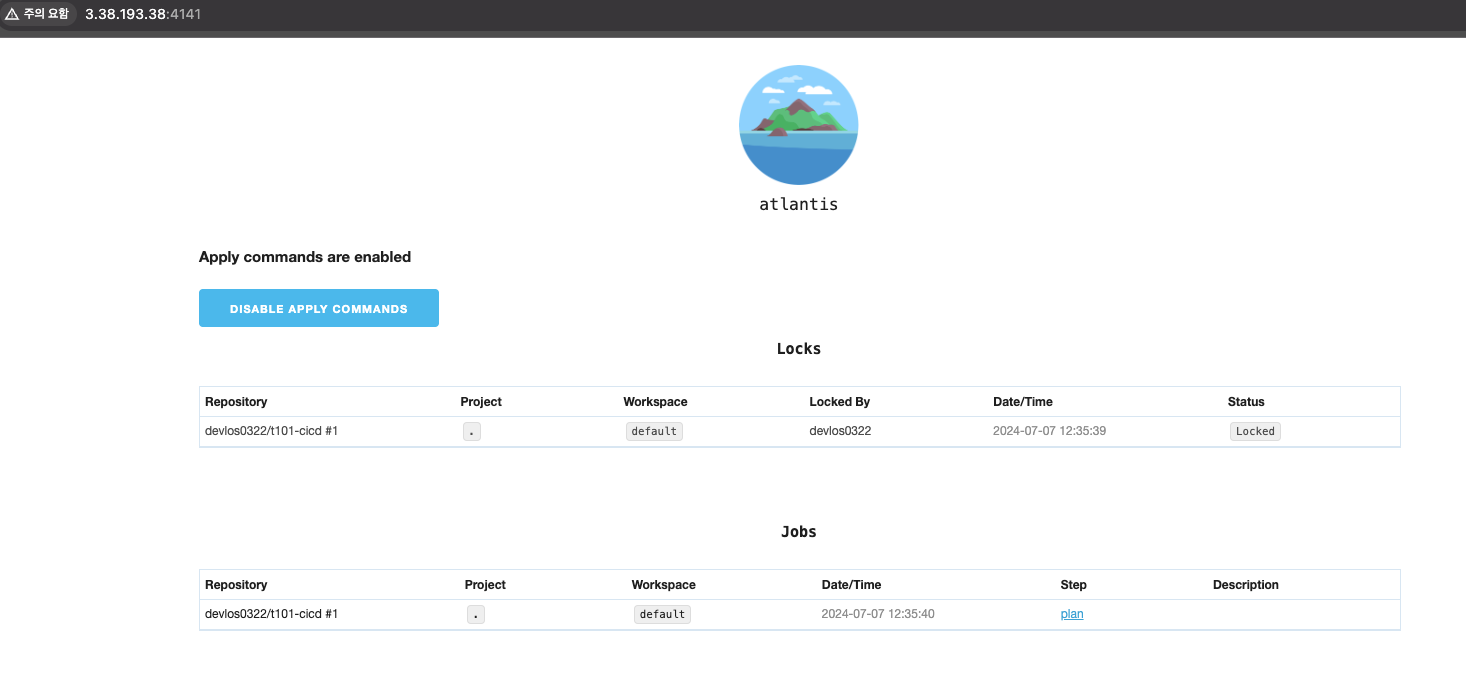 그렇게 되면 아틀란티스서버에서 apply가 수행된 상황을 확인할 수 있고 Locking 상태가 풀려있음을 관찰할 수 있습니다.