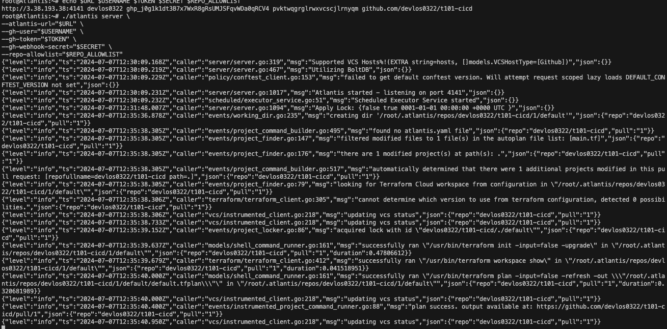 Create Pull request 를 수행하면 다음과 같이 아틀란티스 서버의 로그에서 해당 내용을 수행하기 위한 절차들이 수행되는 것을 확인할 수 있습니다.