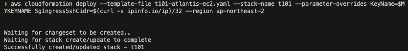 클라우드포메이션을 이용하여 t101-atlantis-ec2.yaml 파일을 배포합니다.