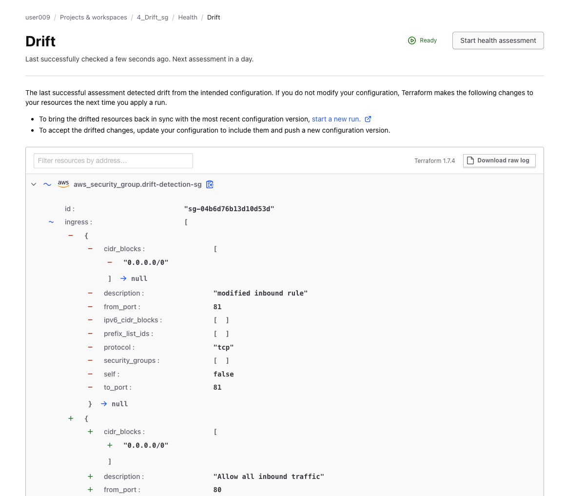 변경된 상태는 TFC에서 감지되어 다음과 같이 Drift가 생성되게 됩니다.