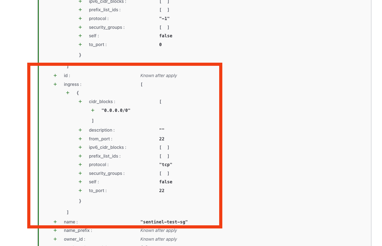 terraform plan은 정상적으로 수행됩니다. 하지만 실행계획을 검토해 보면 Security Group의 ingress cidr이 0.0.0.0/0으로 모든 IP에 대해 개방되어 있습니다.