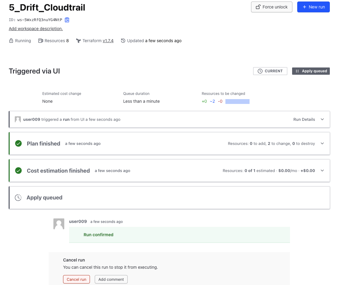 다음과 같이 앞의 실습처럼 차이에 대한 Drift가 생성되고, New run을 통해 복구를 수행할 수 있습니다.