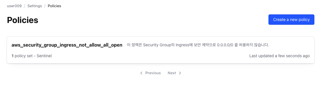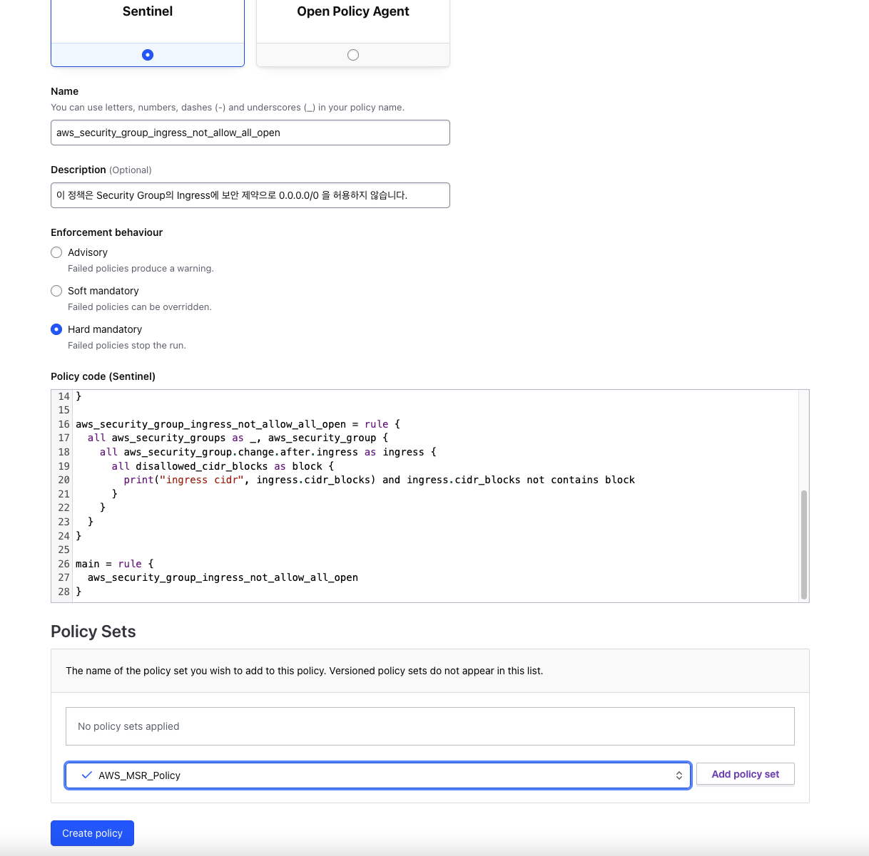 정책은 개별 Policy와 이를 그룹핑하고 적용하는 Policy Set으로 나뉩니다. 먼저 2_sentinel-sg 워크스페이스에 적용할 Policy Set을 생성합니다.