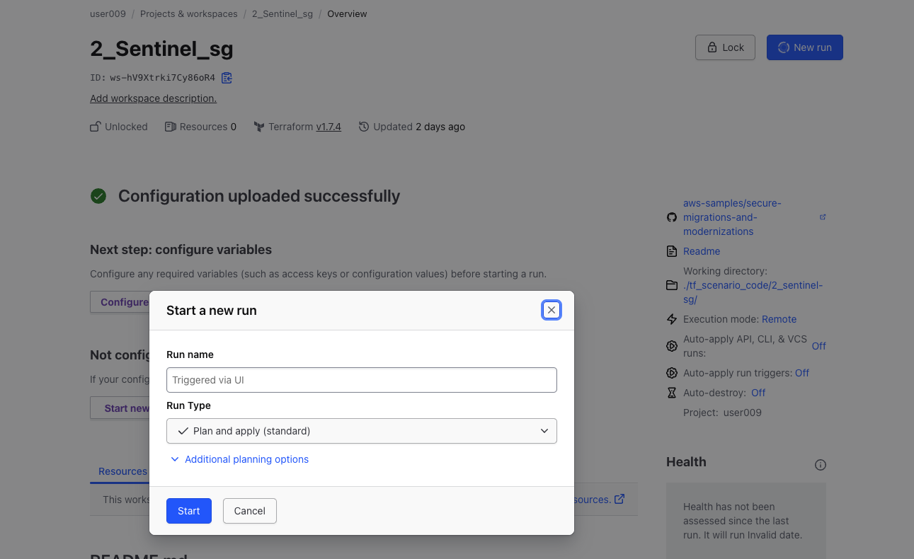 new run을 통해 apply를 수행하고, TFC의 Continues Validation의 Start health assessment를 설정합니다.
