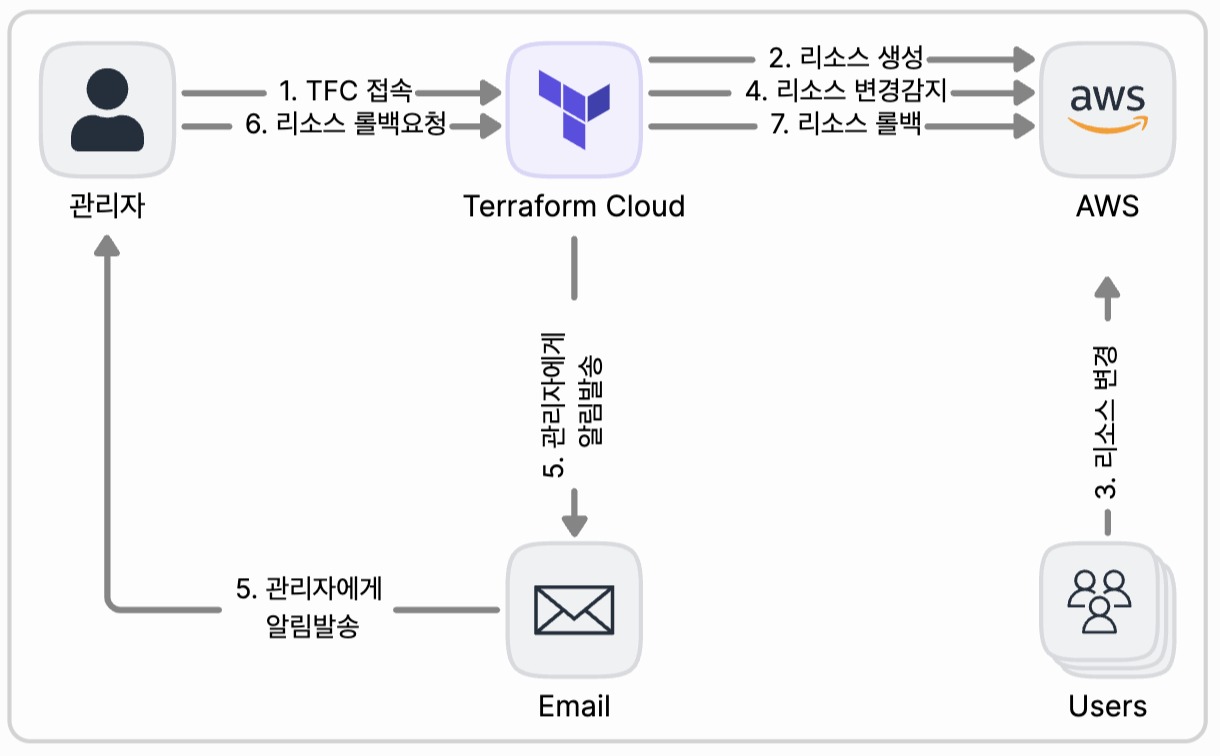 워크숍에 제시된 전체적인 워크플로우는 관리자가 TFC(Terraform Cloud)에 접속하여 리소스를 생성했을 때, 제삼자가 리소스를 변경하여 상태를 임의로 변경하는 것입니다. 그렇게 되면 TFC에서 리소스 변경을 감지하여 관리자에게 이메일을 통해 알림을 전달합니다. 관리자는 TFC를 통해 간단히 리소스 롤백요청을 하게 되고 정상적으로 리소스가 복원되도록 합니다.