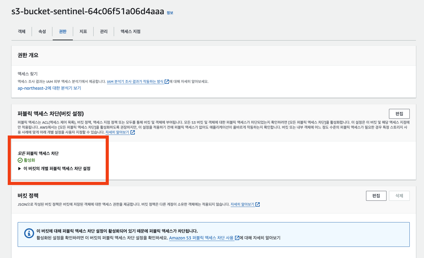 S3 버킷 수준에서 퍼블릭 액세스를 차단하여 오브젝트 퍼블릭 액세스 권한을 갖지 않도록 제어하는 실습을 진행했습니다.