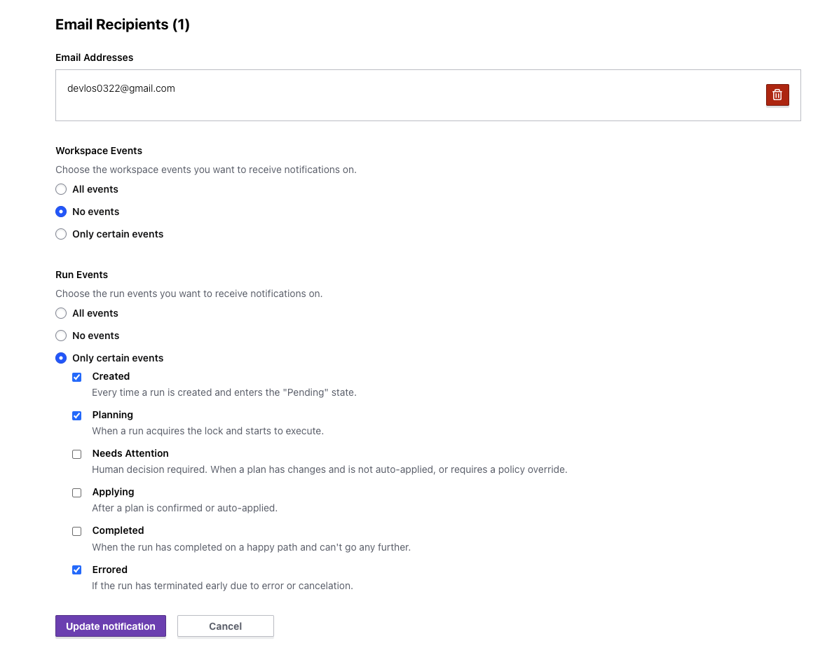 TFC에서 제공하는 Notifications를 통해 이메일을 수신할 대상을 설정합니다.