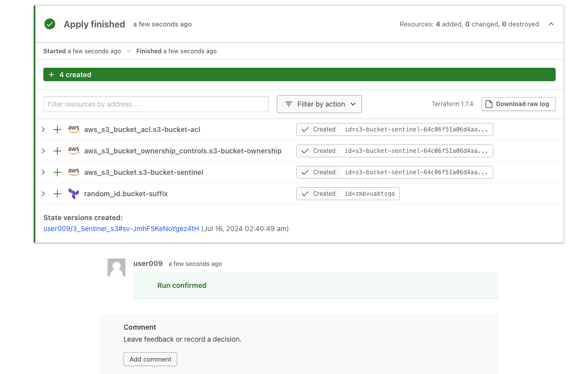 앞의 실습과 마찬가지로 precondition 기능을 통해 Terraform 작성코드 수준에서 Security Group에 대한 정책을 정의하고, 방어할 수 있습니다. 프로비저닝을 취소한 과정에서 Download Sentinel Mock 버튼을 클릭하여 테라폼이 작성한 실행계획을 다운로드하고, https://play.sentinelproject.io 에서 정책을 작성해 봅니다.