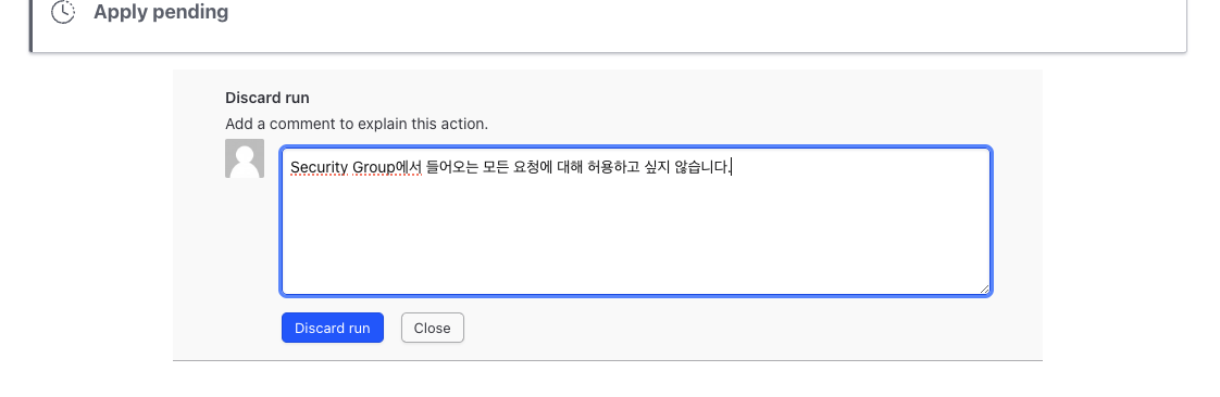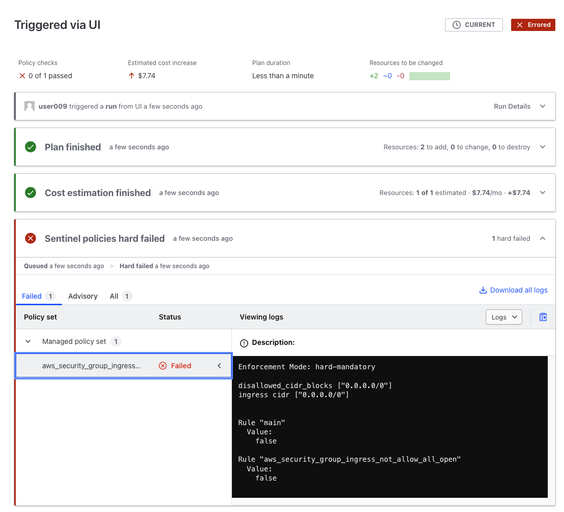 Security Group의 Ingress에 대한 보안 제약사항으로 0.0.0.0/0 정책을 허용하지 않도록 Policy를 생성하였습니다. 이렇게 되면 이전과 같이 New run을 수행 시 제약 사항으로 인해 프로비저닝이 제한됩니다.