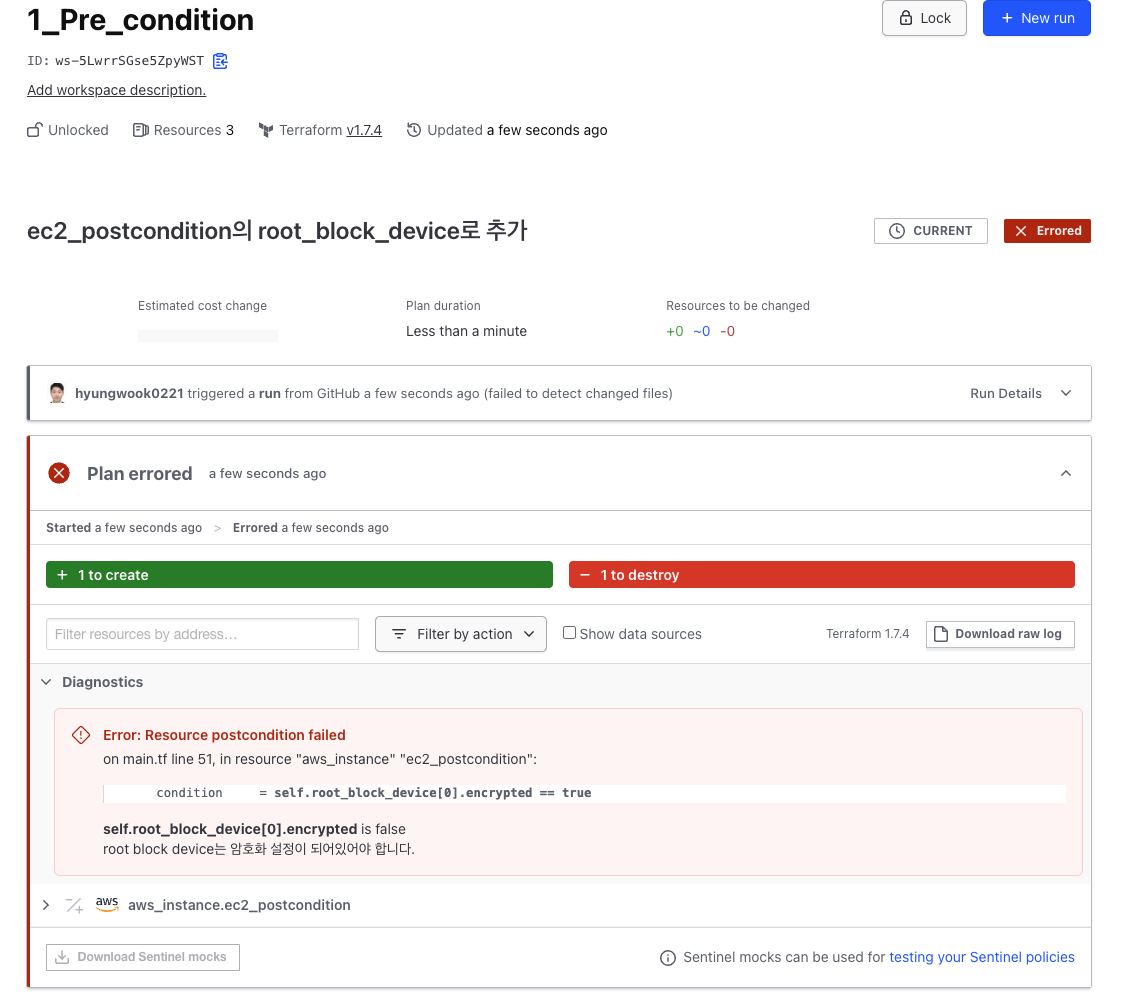 이 상황을 해결하기 위해 [postcondition-encrypted] 브렌치로 변경하여 root_block_device 블록의 encrypted를 true로 설정합니다.