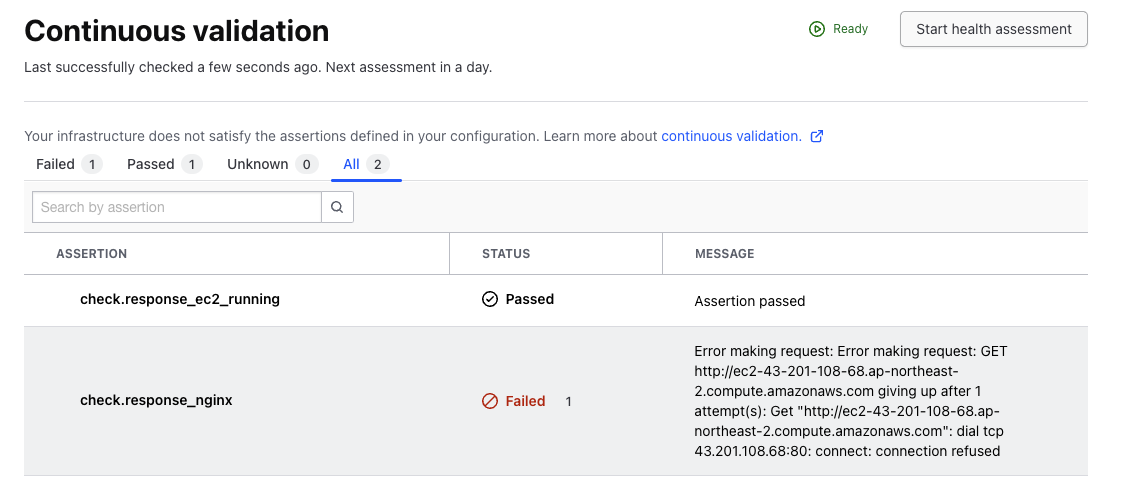 Nginx를 다시 실행시키면 다음과 같이 정상적으로 상태가 통과되는 것을 확인할 수 있습니다. TFC의 Drift Detection 기능을 활용하여 AWS 리소스의 구성 정보에 대한 거버넌스 그리고 Continuous Validation은 OS, 서비스, 애플리케이션에 대해서 지속적인 거버넌스를 가질 수 있습니다.