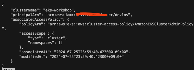 aws eks list-associated-access-policies --cluster-name eks-workshop --principal-arn arn:aws:iam::${ACCOUNT_ID}:user/${MYIAMUSER} | jq