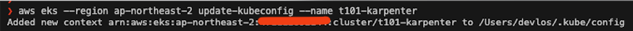 aws eks --region ap-northeast-2 update-kubeconfig --name t101-karpenter