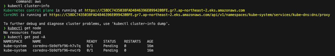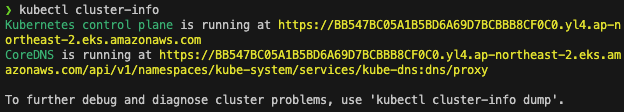이렇게 하면 현재 사용자의 ~/.kube/config에 자격증명 파일이 생성되어 EKS 클러스터에 접속이 가능합니다.