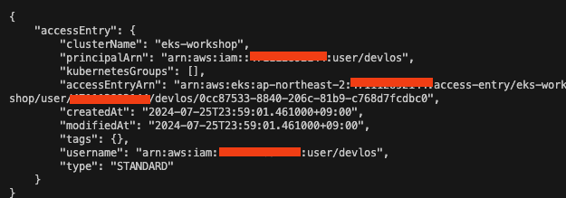 aws eks describe-access-entry --cluster-name eks-workshop --principal-arn arn:aws:iam::${ACCOUNT_ID}:user/${MYIAMUSER} | jq