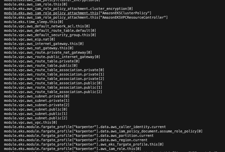 배포하고 state list를 살펴보면 eks, vpc, eks.module 등 모듈 별로 설치가 잘 된 것을 확인할 수 있습니다.
