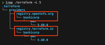 tofu init을 수행한 후 프로바이더를 확인해 보면 registry가 opentofu로 설정된 것을 확인할 수 있습니다.