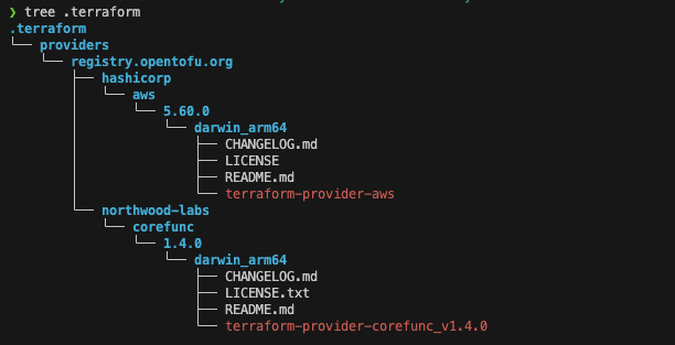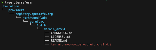 프로바이더 정보를 확인하면 다음과 같이 northwood-labs에서 만든 corefunc를 확인할 수 있습니다. 또한 레지스트리도 opentofu로 변경되어 있습니다.